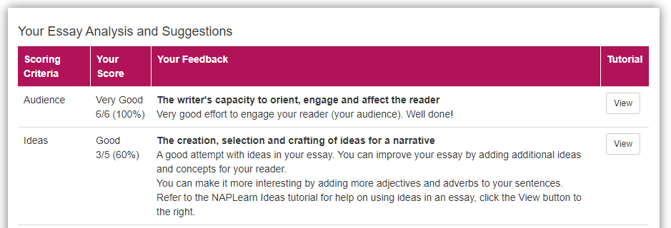 for their NAPLAN* writing test. The feedback provided on an essay is designed to enable the student together with parents to discuss the strengths and weaknesses of an essay, and